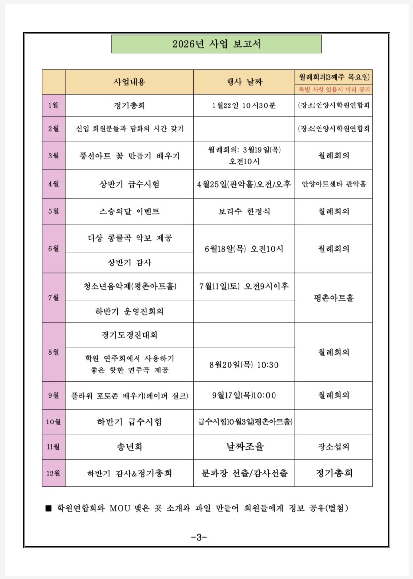 첨부드린 2026년 사업보고서에 따라 매월 셋째 주 목요일에 진행되는 월례회와 각종 행사 일정을 참고해 주시기 바랍니다.