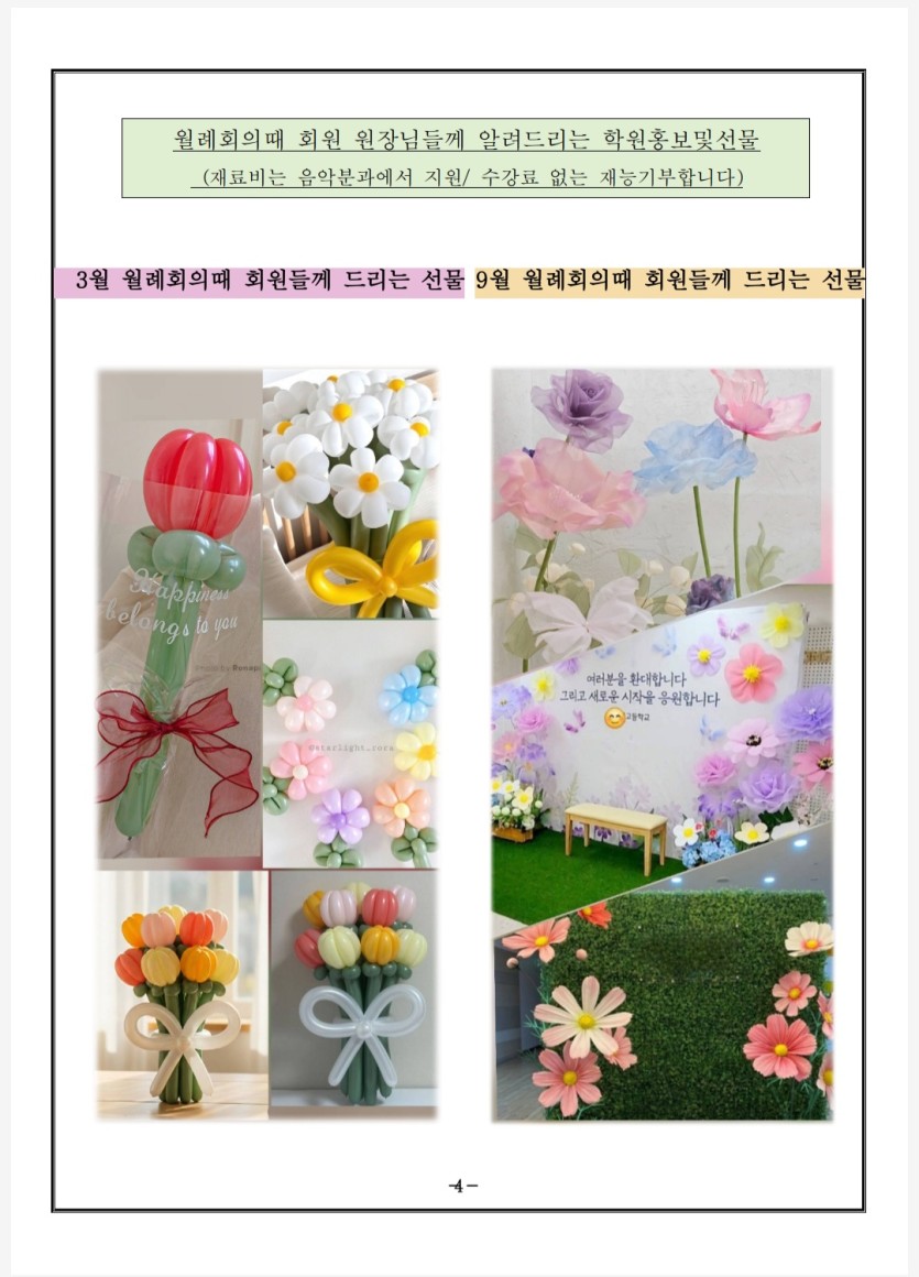 특히, 3월에는 ‘풍선아트 꽃 만들기 배우기’가 준비되어 있고, 6월과 9월에도 회원분들께 드리는 특별 선물이 준비되어 있으니 많은 관심과 참여 부탁드립니다.
